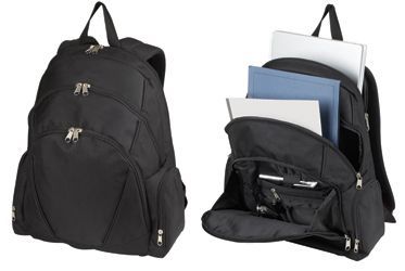 These backpacks measure 14"x18"x8" and feature zippered main compartment with padded laptop pouch, two zippered compartments with organizer, two zippered side pockets, heavily padded back panel for carrying comfort, adjustable padded backpack straps, poly-web handle.