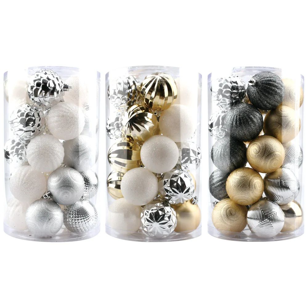 This 25-count Christmas ball set adds a stylish and festive flair to your holiday decor with elegant gold, grey, white, and silver colors.