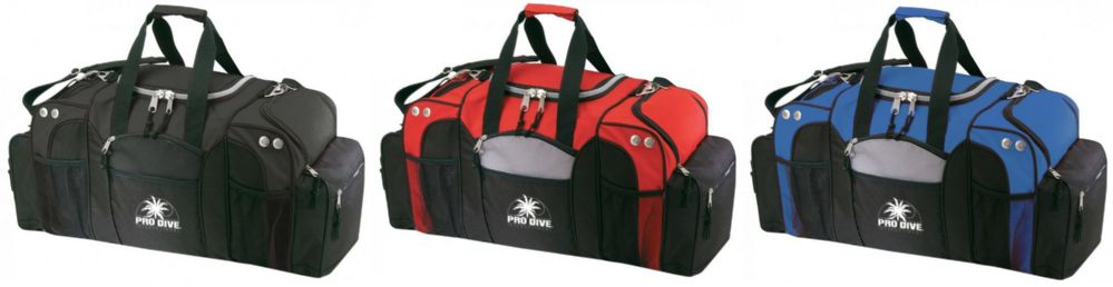 These bags measure 27-1/2"x15"x11" and are constructed from 600-denier polyester with heavy vinyl backing. They feature a large zippered main compartment with front mesh pocket and water bottle pocket. Carrying handle with adjustable and removable shoulder strap.