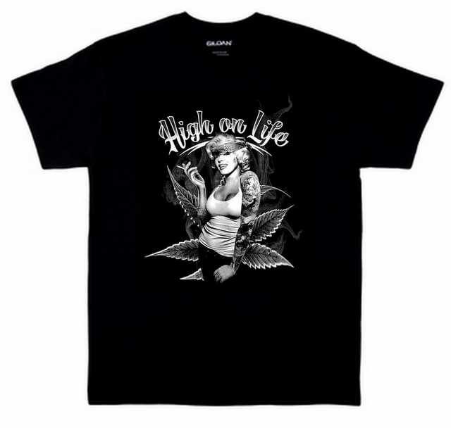 Express your vibe with the High On Life Lady Marijuana Leaf Black Shirts, crafted from high quality, durable, and lightweight fabric, featuring a large stylish graphic chest print, available in sizes M, L, and XL for a comfortable and fashionable fit.