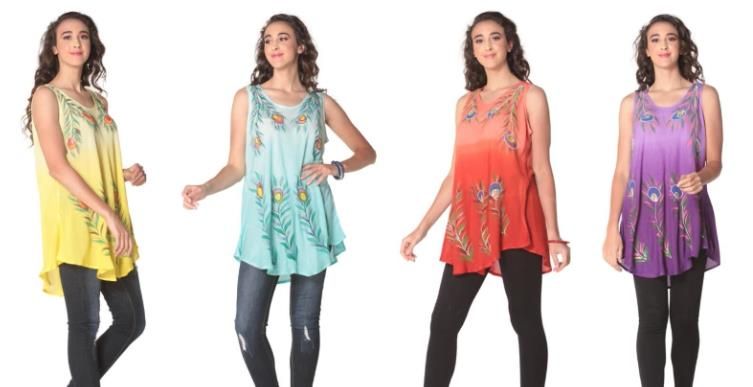 These tie-dye rayon tops with peacock feather prints offer a vibrant and stylish look, available in assorted colors and designed to fit most sizes comfortably.