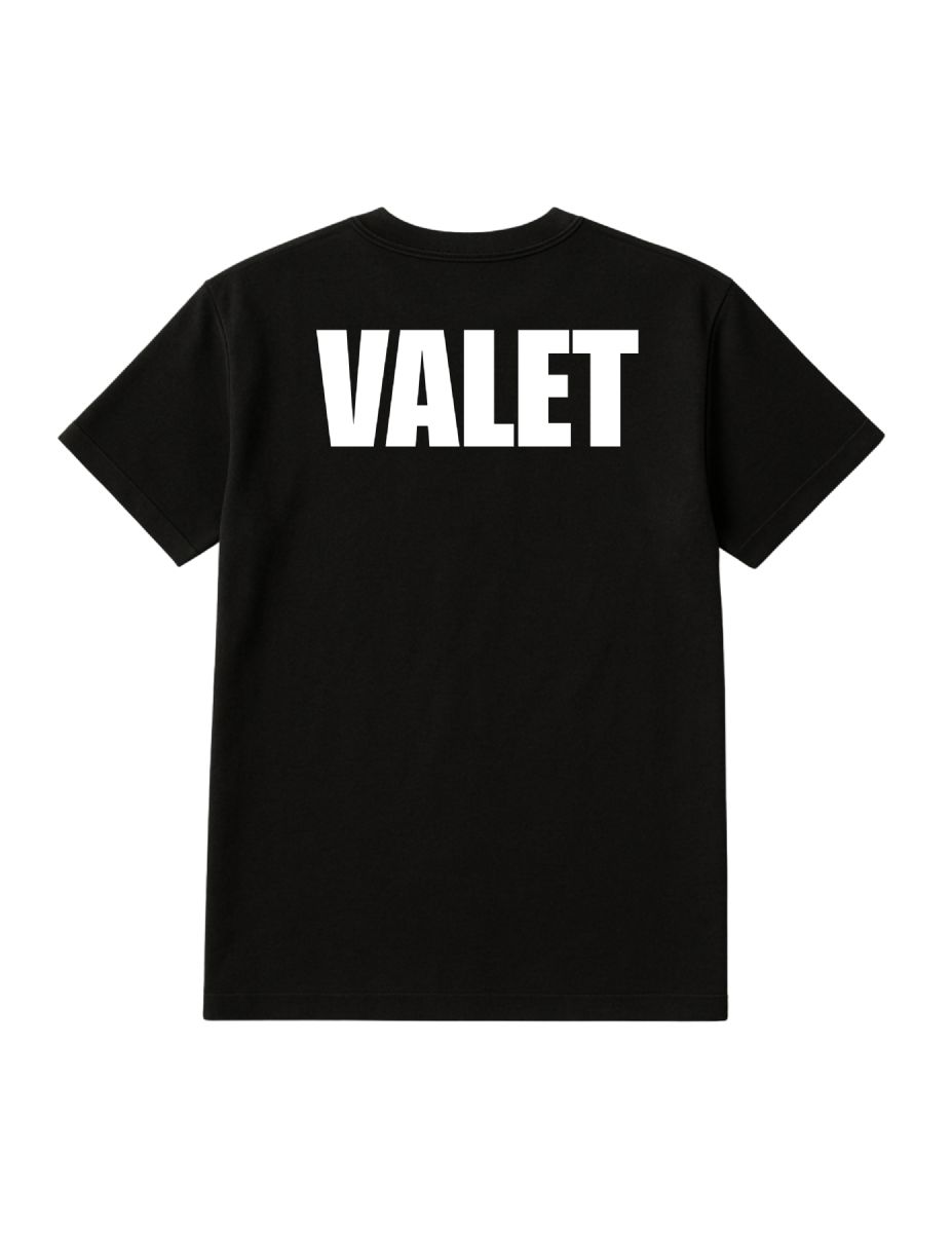 This Unisex Cotton Valet Printed T Shirt is a professional choice for workwear. The black tee features a clear white valet print on both the back and front, making it highly visible and perfect for your job. This shirt is a size 2X-Large.