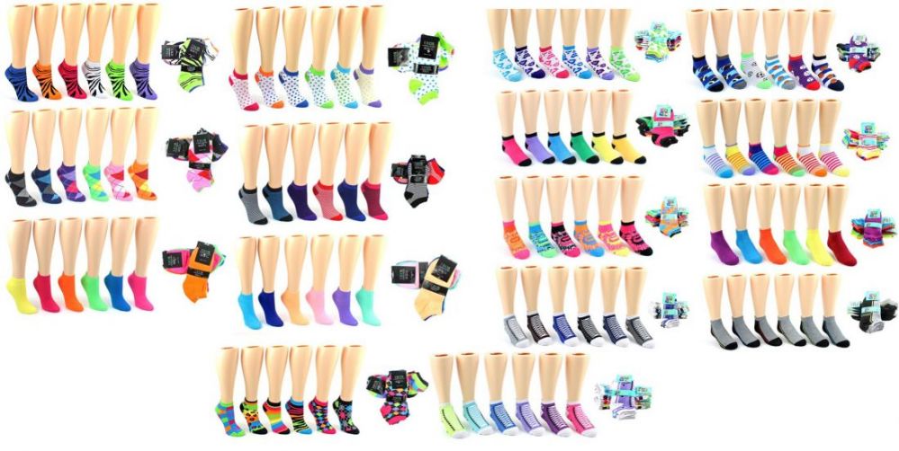 This is an assortment of our ladies and kids novelty low-cut sock styles. There are 60 pairs of ladies size 9-11, 60 pairs of boy's, and 60 pairs of girl's. Boy's and girl's will have assorted sizes 1-3, 4-6, and 6-8 (covering toddlers through age 12). Each pair is individually tagged, and there is a band around every 3 pairs, giving you the option of selling them either as single pairs or as 3-pair packs. 80% Polyester, 10% Spandex, 10% Nylon. Styles will vary based on availability.
