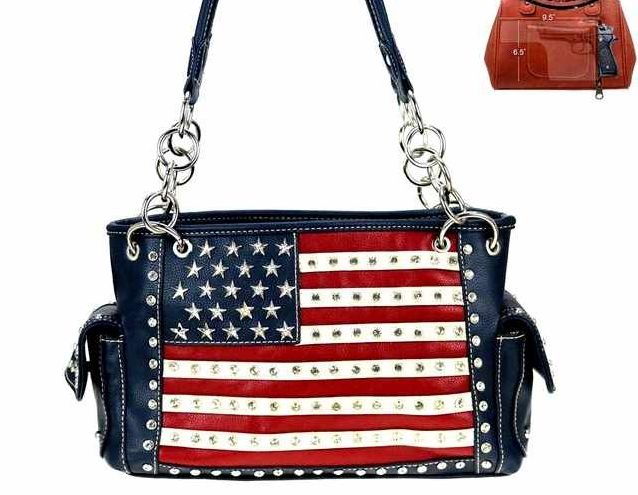 Made of PU leather , this handbag has: American flag design on the front Silver stars and crystal studs Top zipper closure Inside single compartment divided by a medium zippered pocket Inside of bag include a zippered pocket and 2 open pockets A zippered pocket on the back to conceal the handgun (9 x 5.5) A pocket on each side that snap close An open pocket on the back Metal feet on the bottom for protection and stability Double flat/chain handle