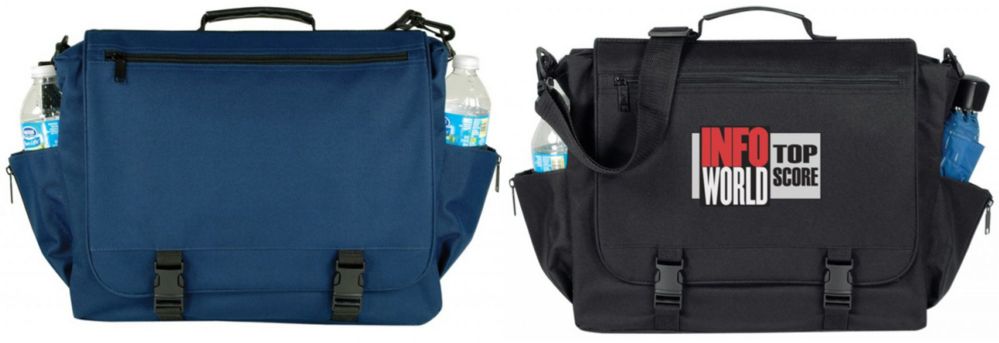 These briefcases measure 16"x12"x3-1/2" and are constructed from 600-denier polyester with heavy vinyl backing. They feature a zippered main compartment and smaller front zip pocket with side zipper pockets. Top grab handle with adjustable and removable shoulder strap.