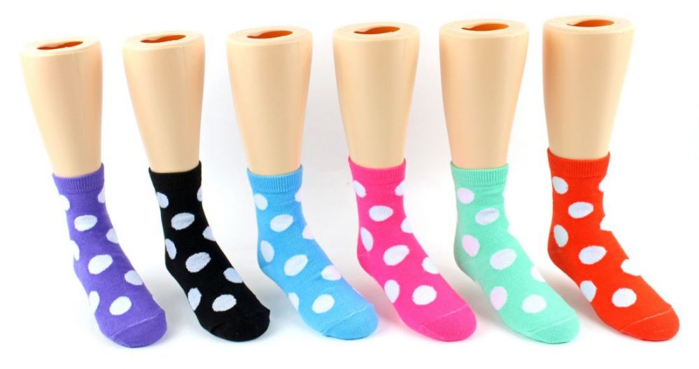 These polka dot patterned kid's socks fit approximately ages 1 through 3 and come in assorted colors. Each pair is individually tagged, and there is a band around every 3 pairs, giving you the option of selling them either as single pairs or as 3-pair packs. 80% Polyester, 10% Spandex, 10% Nylon.