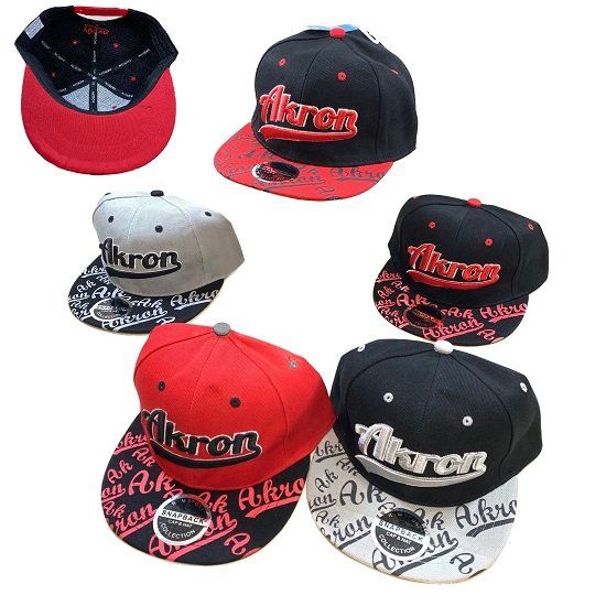 The Snap Back Flat Bill Hat with a Script Akron print on the bill offers a trendy and comfortable fit, perfect for casual wear and adding a stylish touch to any outfit.