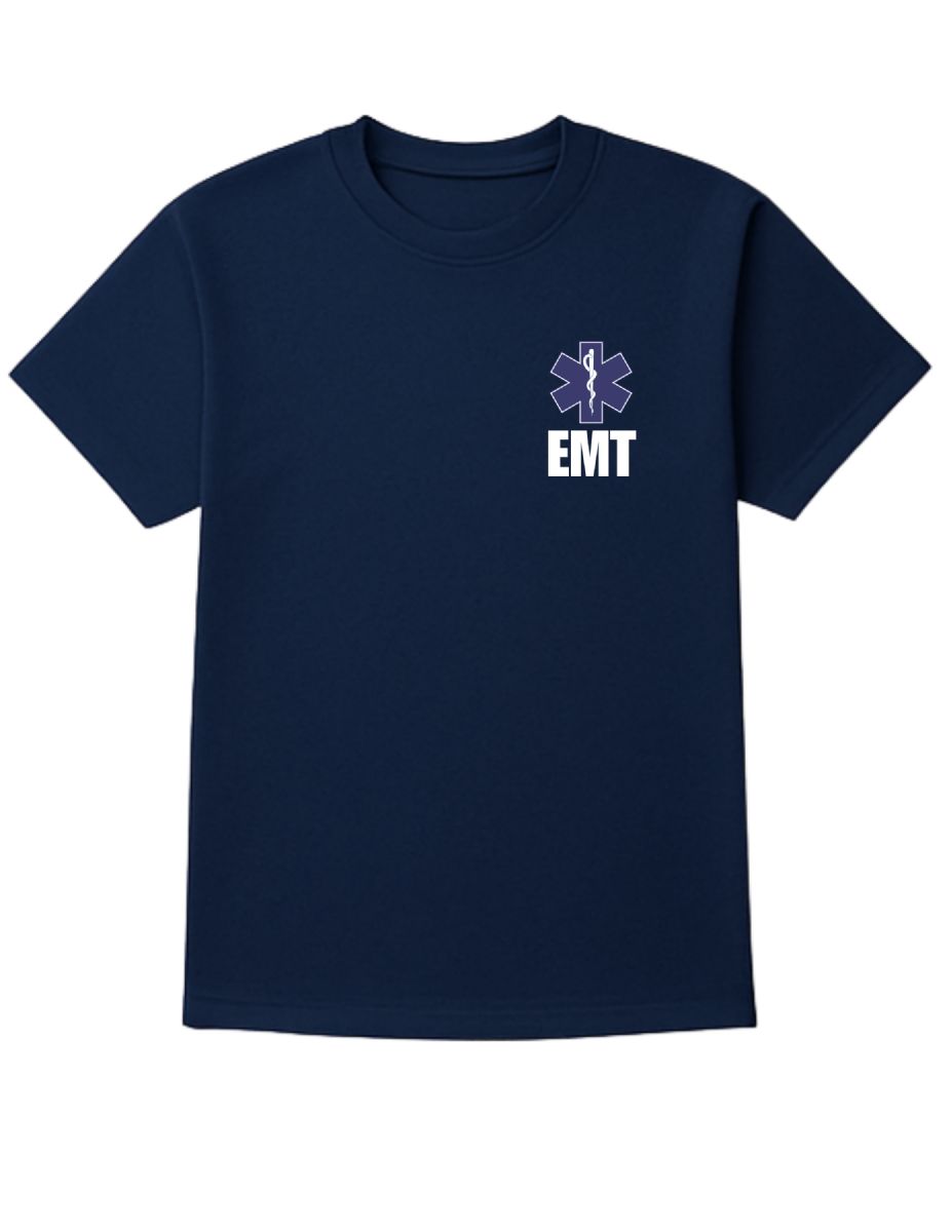 24 Wholesale Unisex Cotton Emt Printed T Shirt Navy With White Print Back And Front Size 3X-Large