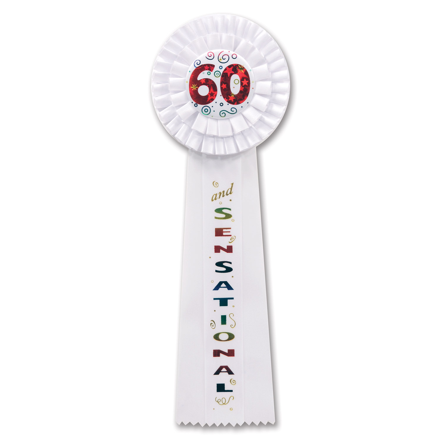 Celebrate a milestone in style with the 60 & Sensational deluxe rosette, a festive birthday-age specific award designed to make any 60th celebration unforgettable. Measuring 4.5" x 13.5", this eye-catching rosette features a white base with vibrant multicolor print, perfect for standing out at parties and special events. Crafted from high-quality materials, it is both durable and stylish, making it a fun accessory that also serves as a memorable keepsake. Ideal for birthday parties, award presentations, or themed gatherings, this rosette brings charm and cheer to the celebration.