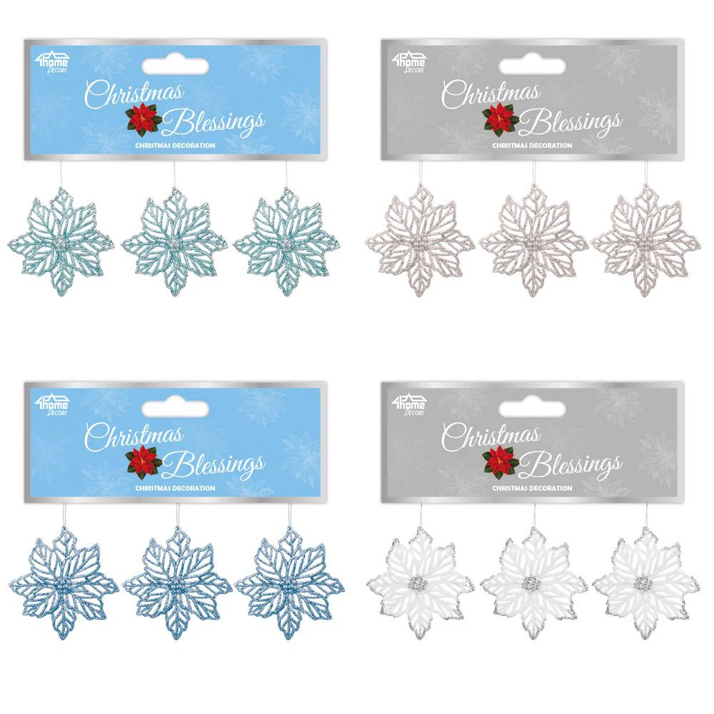Add a soft, festive touch to your holiday décor with this 3-pack of assorted light-colored poinsettia ornaments, sparkling in 4 colors and measuring 15 cm each.