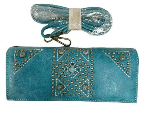 Made of PU leather , this western wallet/crossbody has: Antique gold and patina studded tribal pattern Accented with turquoise stone concho Button closure Single compartment divided by a medium zipper pocket Multiple card slots and 2 long slot compartments Detachable crossbody strap included