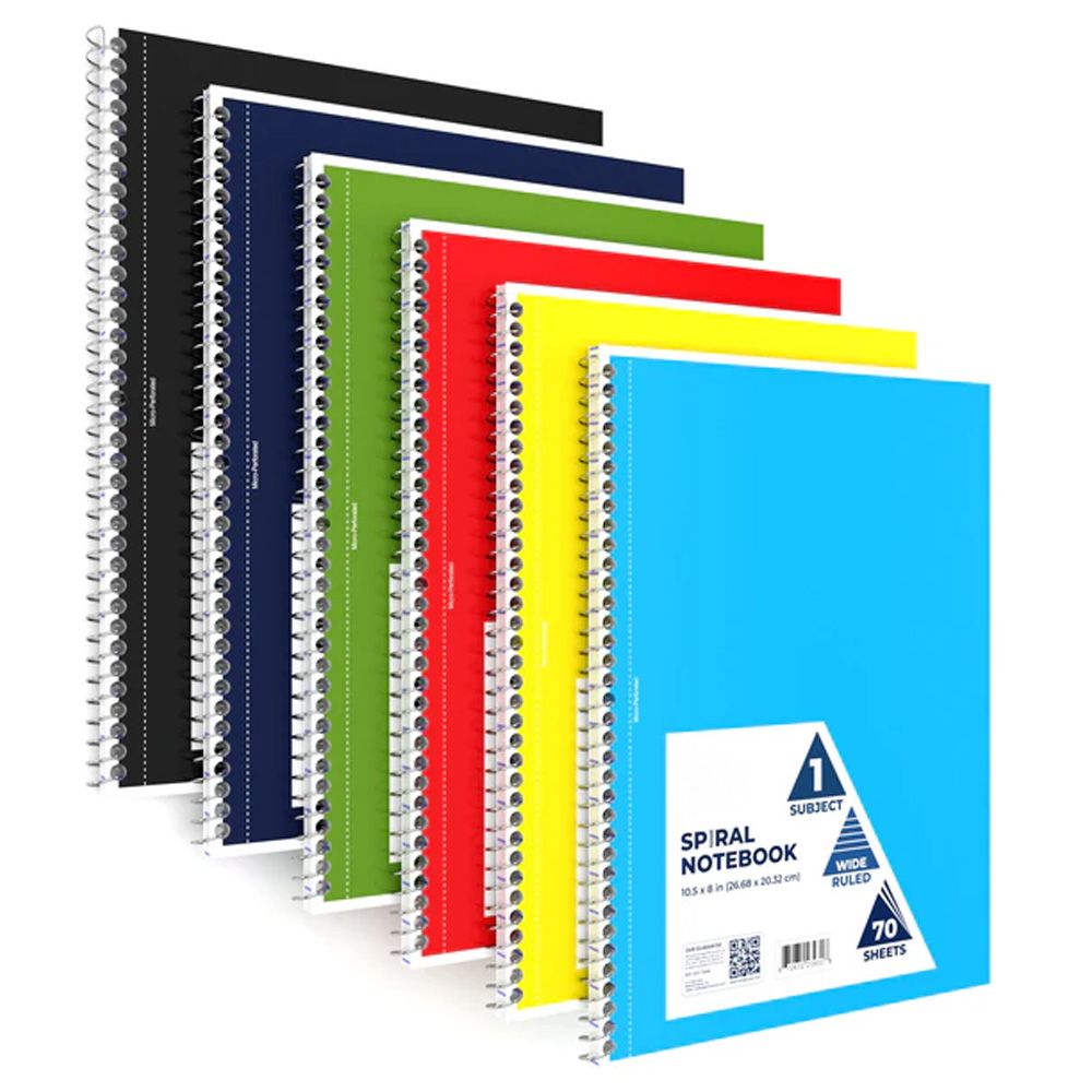 Keep your notes neat and organized with the 1-Subject Spiral Notebook, designed with high-quality wide-ruled paper that offers plenty of space for writing, planning, or studying. Measuring 10.5 x 8 inches, this notebook is the perfect size for school, work, or home use, and its durable spiral binding allows pages to lay flat for easy writing and quick flipping. With 70 sheets per notebook, you?ll have ample room to manage assignments, capture meeting notes, or draft ideas on the go. The assorted color covers add variety and personality to your stationery, helping you stay both organized and inspired throughout your day. Whether you're a student, a professional, or someone who simply loves to write, this spiral notebook delivers reliable performance in a stylish and functional design that fits effortlessly into any bag or workspace.