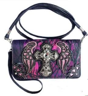 The Purple Camo Cross with Wing Wallet Purse combines functionality with a unique, stylish design, providing a chic accessory that serves as both a wallet and a purse, ideal for those who appreciate bold fashion statements.