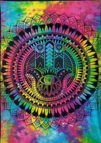 This BULK order includes a collection of vibrant and unique tapestries featuring a tie-dye pattern and the Hamsa Hand symbol. These tapestries are perfect for adding a touch of bohemian flair to any space.