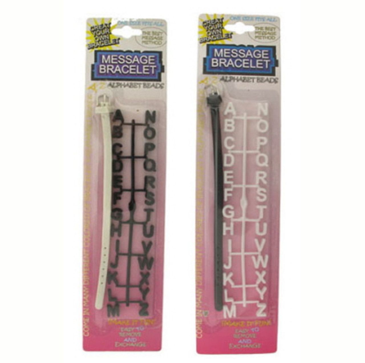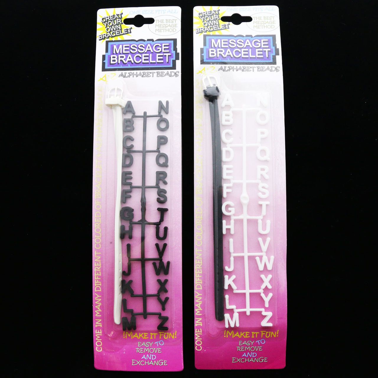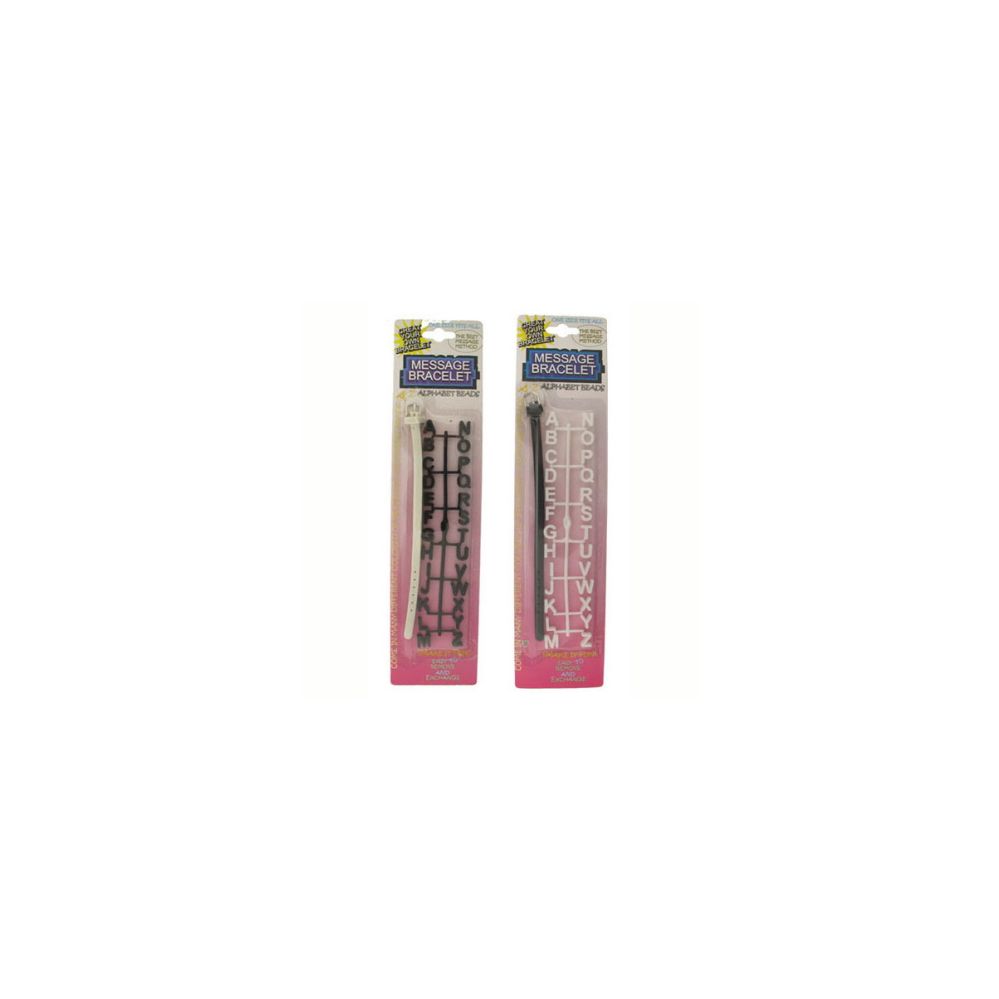 Black and white colored rubber alphabet message bracelets. Each is individually carded and in its own poly bag ready for display.