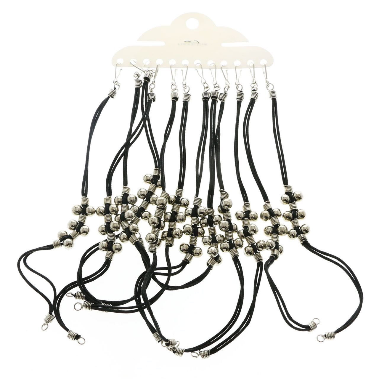 Bracelet, silver-tone cast beads on black cords, silver-tone hook clasp closure, 8 1/2 inches long, bracelets are on a hanging display