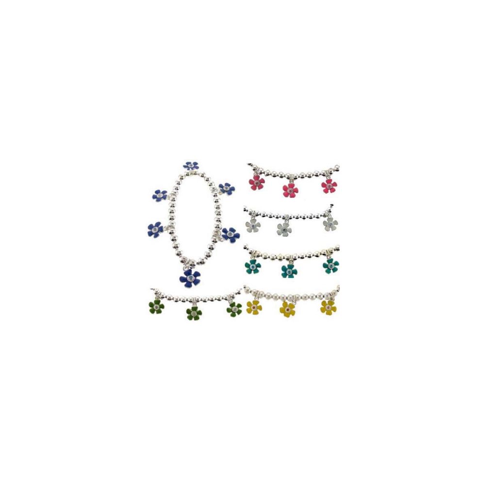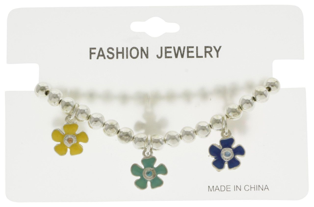 Silver-tone charm bracelets with assorted color enameled charms in flower motif and rhinestone accent, each set is individually carded ready for display