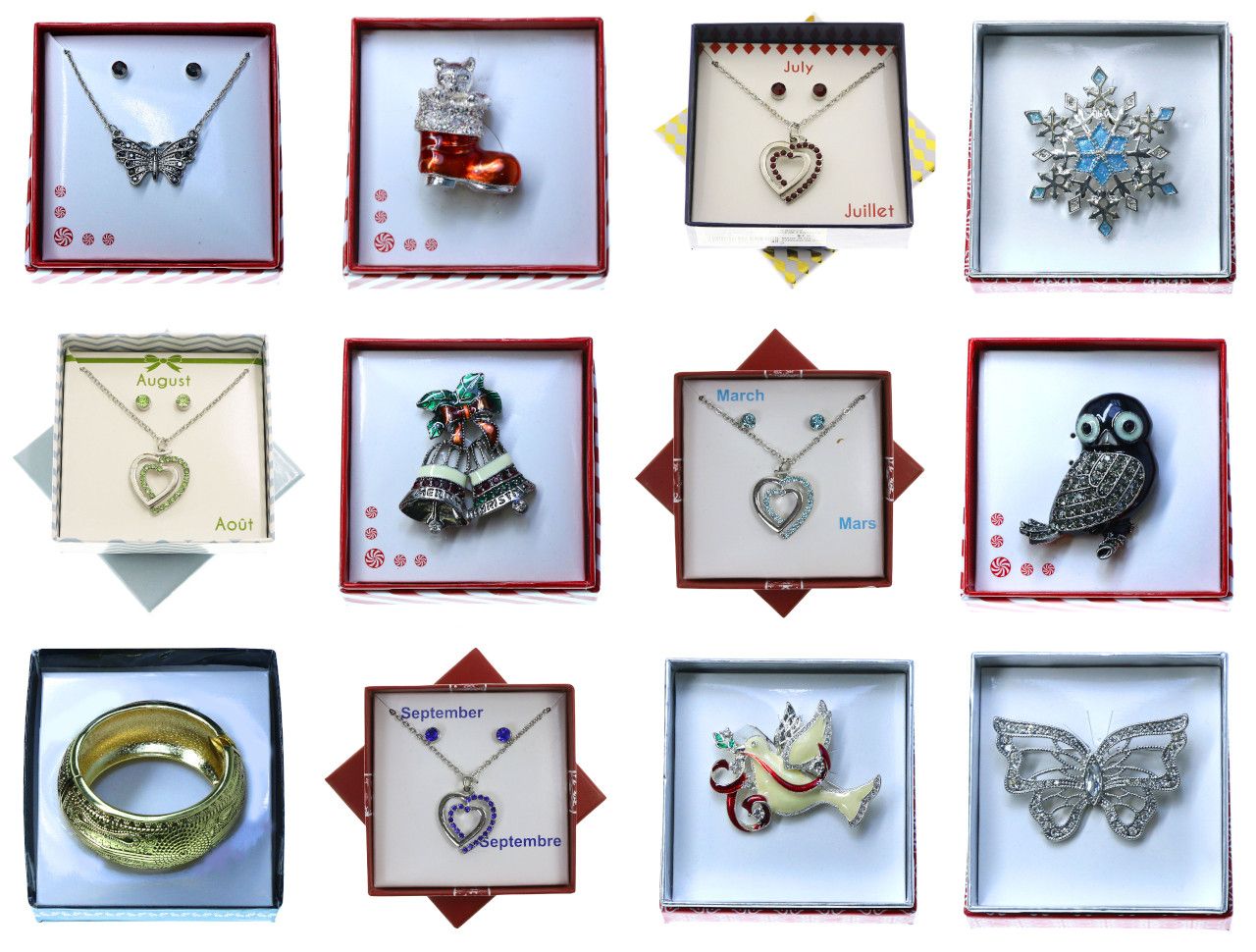 Gift box necklace and earring set assortment that includes 3 of each style GB9034, GB9035, GB9036, GB9037.