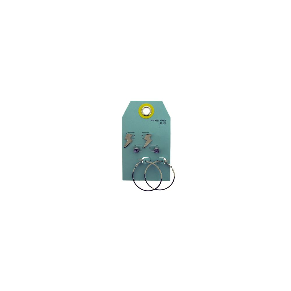 Multiple pairs of silver tone earrings per card, one pair of lightning bolt studs, a pair of purple rhinestone studs, and a pair of silver tone hoops.