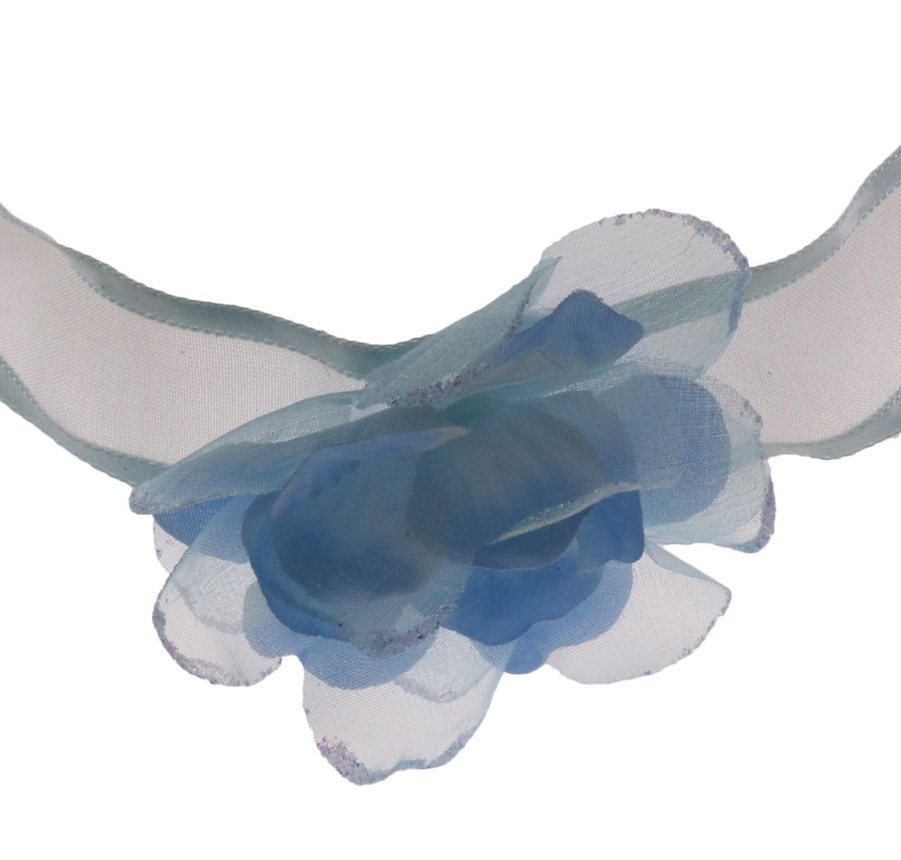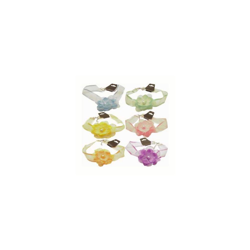Necklace choker, nc299, assorted color fabric flower with glitter and beads on nylon choker, colors include blue, green, pink, yellow, and purple, each is individually carded with keyhole for display