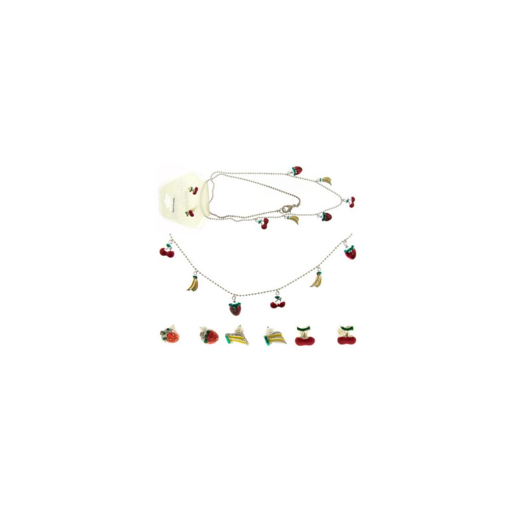 Silvertone chain with assorted fruit pendants, matching earrings, each set is individually carded ready for display
