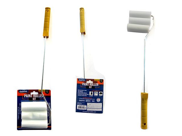 This 4-Piece Paint Roller Set is perfect for all your painting needs. Made of stainless steel, the roller measures 3.5"W and the handle is 20.25"L. It comes in a red color. The set includes an extra-long handle to paint hard-to-reach places.