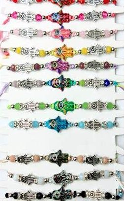 Protect and accessorize with these wholesale evil eye bracelets featuring a hand shape design. Available in assorted colors and with a mix of charms and beads, these adjustable-fit bracelets combine style with symbolic protection.